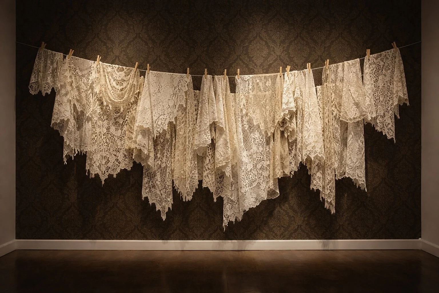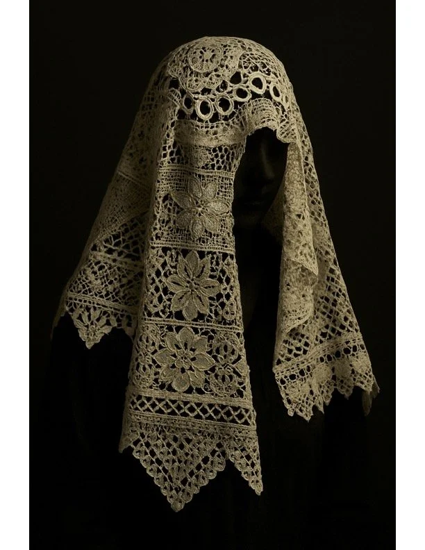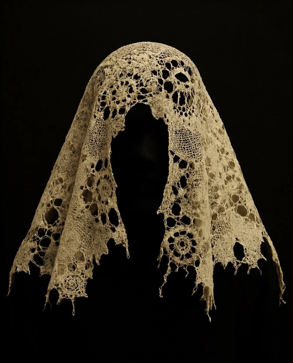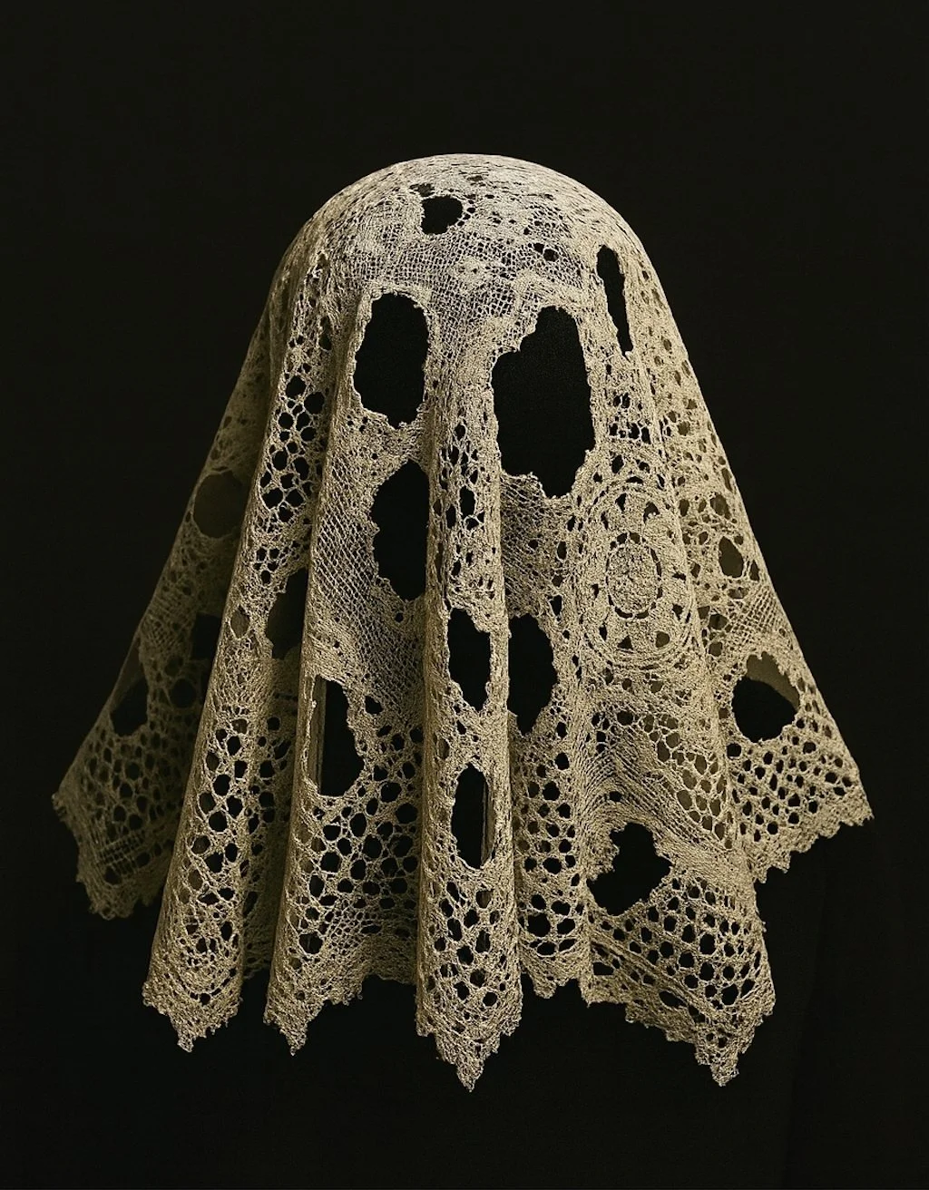 The ghost figure is coupled with aspects of Victorian mourning traditions, yet rejects their visual code of concealment. Light lace replaces black; exposure replaces veiling altogether. Mourning is treated not as something hidden, but as something that alters what can be seen and carried.